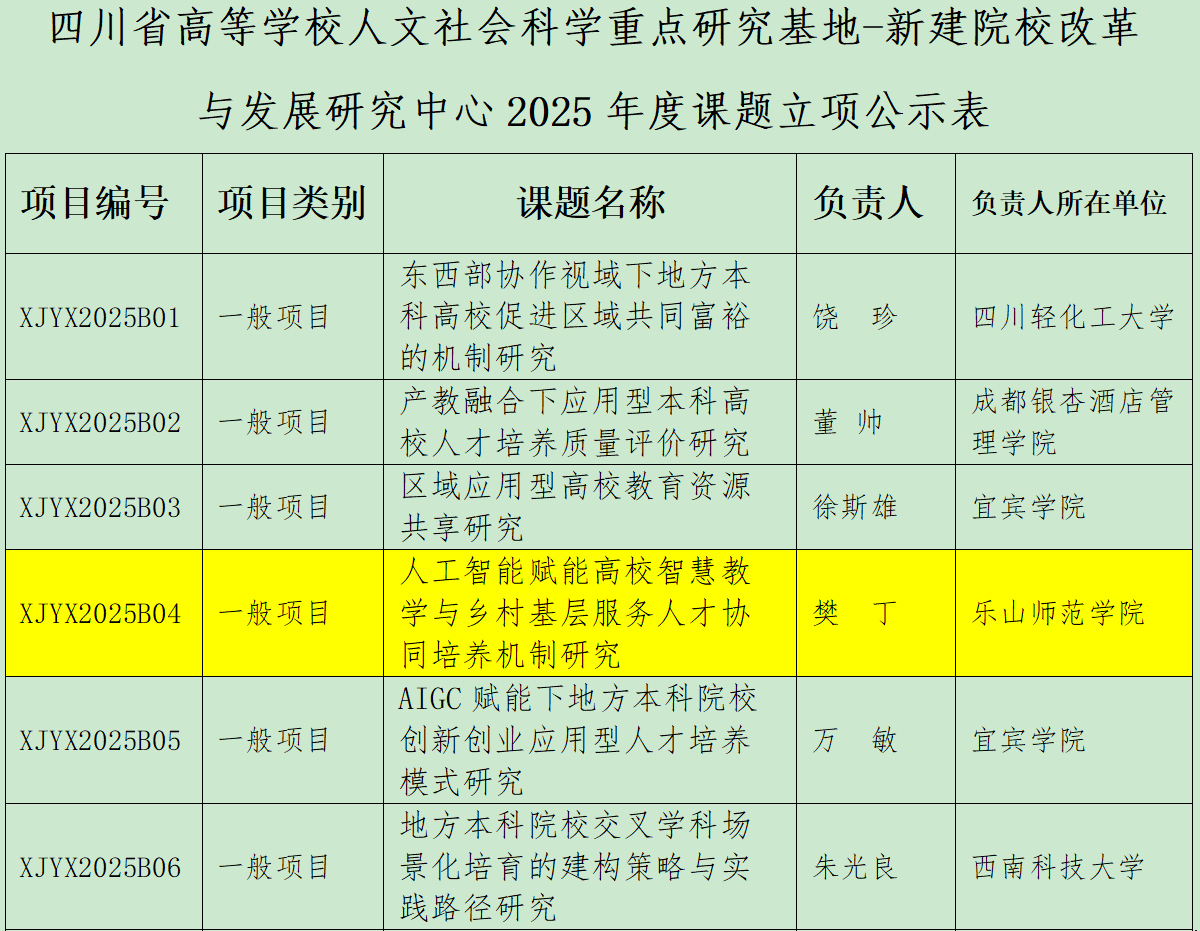 本网讯(图/文袁锐审核/门涛)近日,由樊丁副教授主持的“人工智能赋能高校智慧教学与乡村基层服务人才协同培养机制研究”课题成功获批四川省高等学校人文社会科学重点研究基地-新建院校改革与发展研究中心2025年度课题立项。