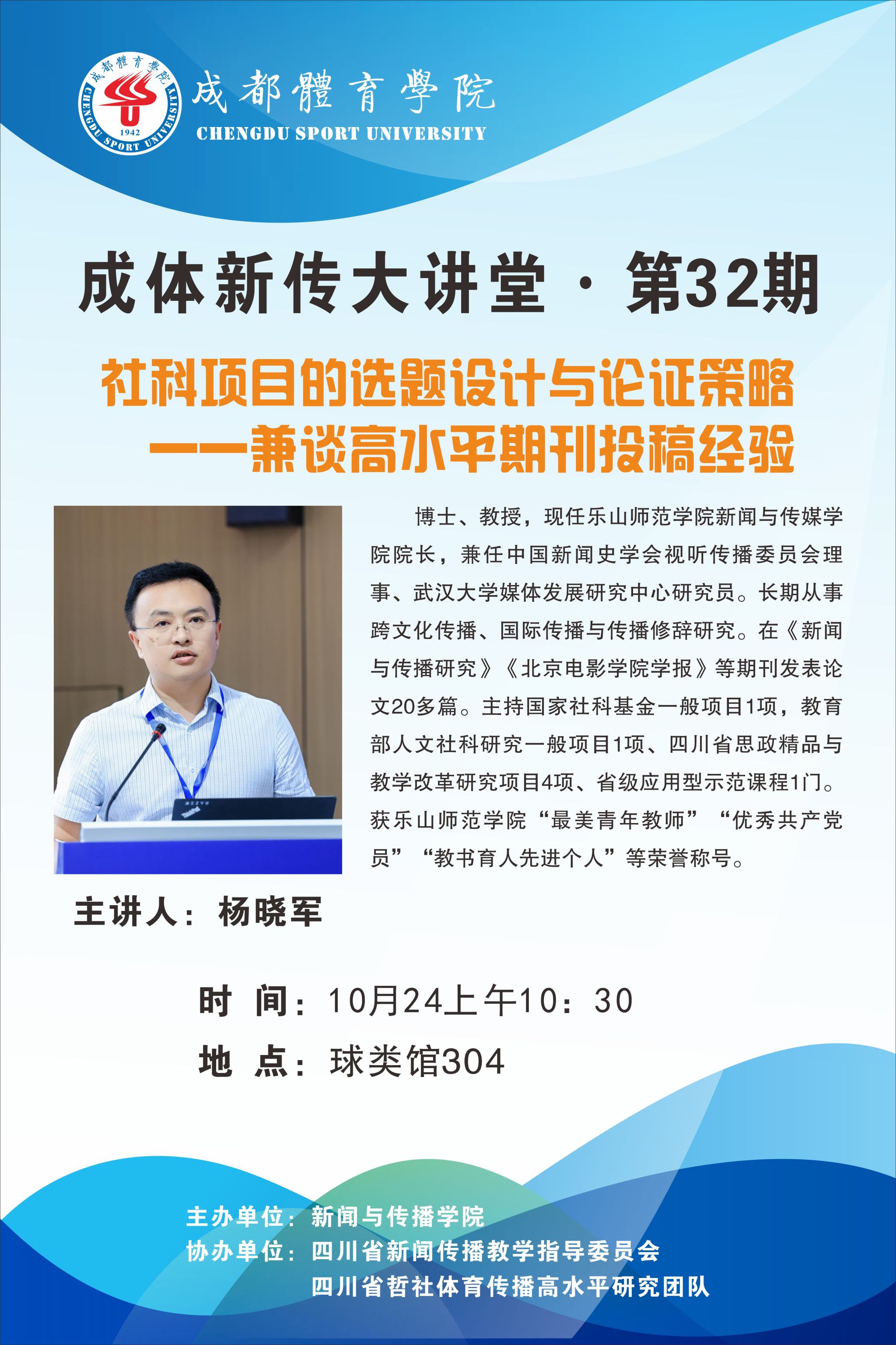 10月24日上午,受成都体育学院新闻与传播学院石磊院长邀请,我院院长杨晓军教授赴蓉城做客“成体新传大讲堂”第32期,为该院老师带去一场题为《社科项目的选题设计与论证策略——兼谈高水平期刊投稿经验》的学术“干货”分享。